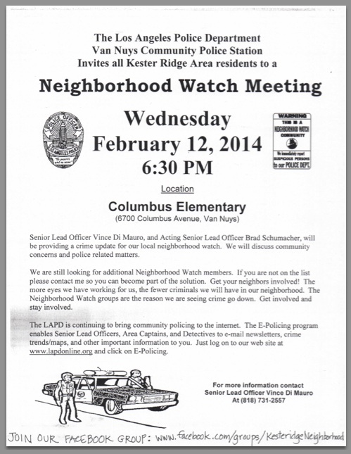 Courtesy of a community minded neighbor, we folks gathered tonight in a computer lab inside Casa Loma College on Kester to hear Senior Lead Officer Erica Kirk, Gang Officer DeLeon and a man from the Los Angeles Department of Building Safety speak about property crimes, prostitution and gangs.