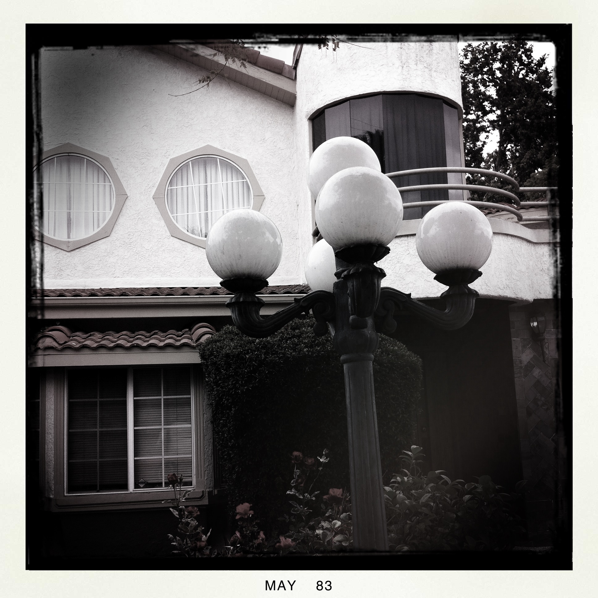 One beastly residence had two octagonal porthole windows, crooked vinyl panes, a Spanish tile roof and a pipe railed 1980s balcony clashing violently with a five-armed ornate lamppost, all elements fighting a generational war of ornament.