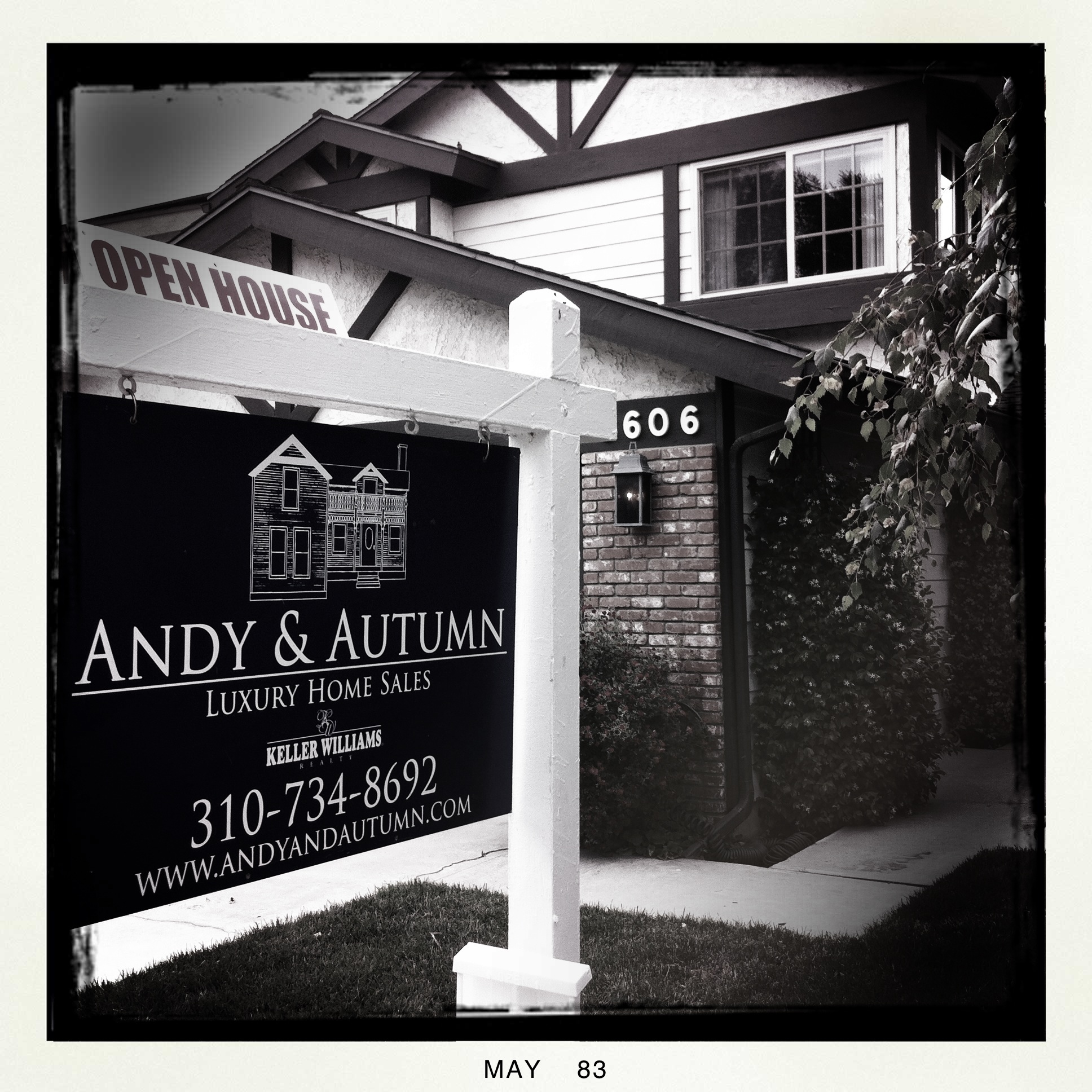 A blue open house sign on the corner of Louise and Vanowen advertised “Andy and Autumn”, two realtors. Alliterative and suggestive, it took my name, suggested a short story or film noir (“Susan and God”?) and reflected the weather: gray, moody, autumnal.