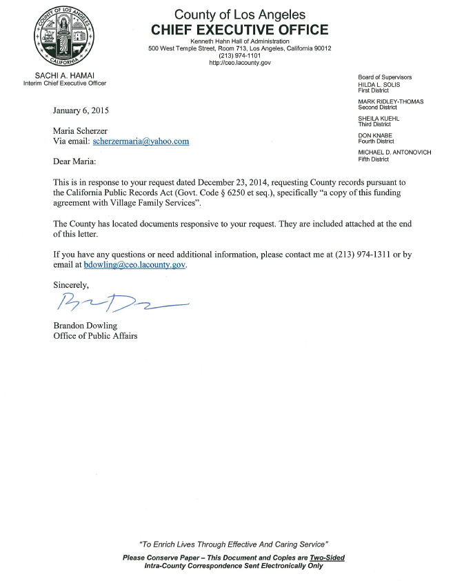 Maria Scherzer, community activist, heard of the home and was shocked that notifications were never provided to other residents of the forthcoming facility. She wrote to the County of Los Angeles, inquiring about the funding agreement, and was sent a copy of the agreement providing $551,250 for the Village Family Services to buy a house.
