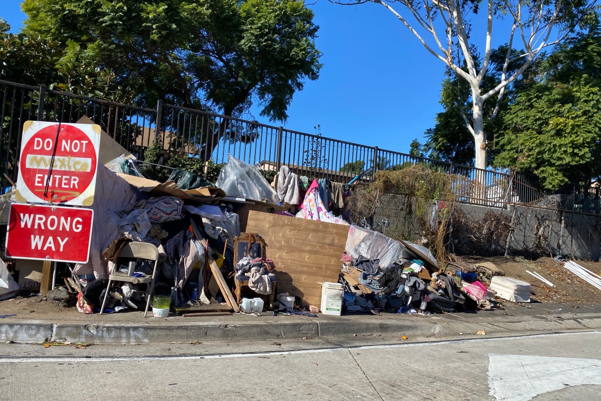 As the road curved into the underpass that runs under the 110 freeway, dozens of people were living in encampments on each side of the street. A Ritz-Carlton luxury hotel glass tower loomed in the nearby downtown. Was this a joke?