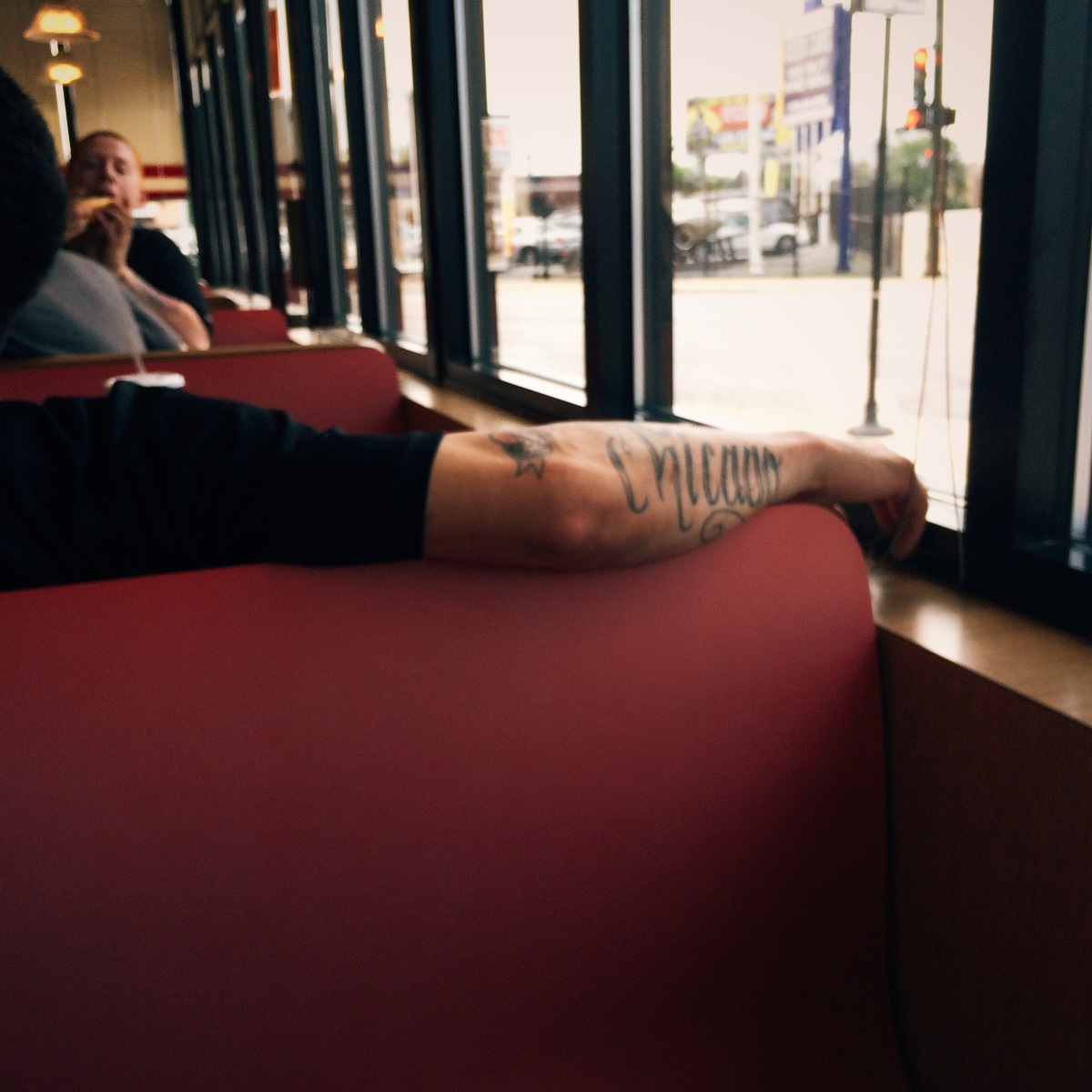 I was in Chicago. A man in the booth in front of me had tattoos on his arms: “Bears” and “Chicago”.