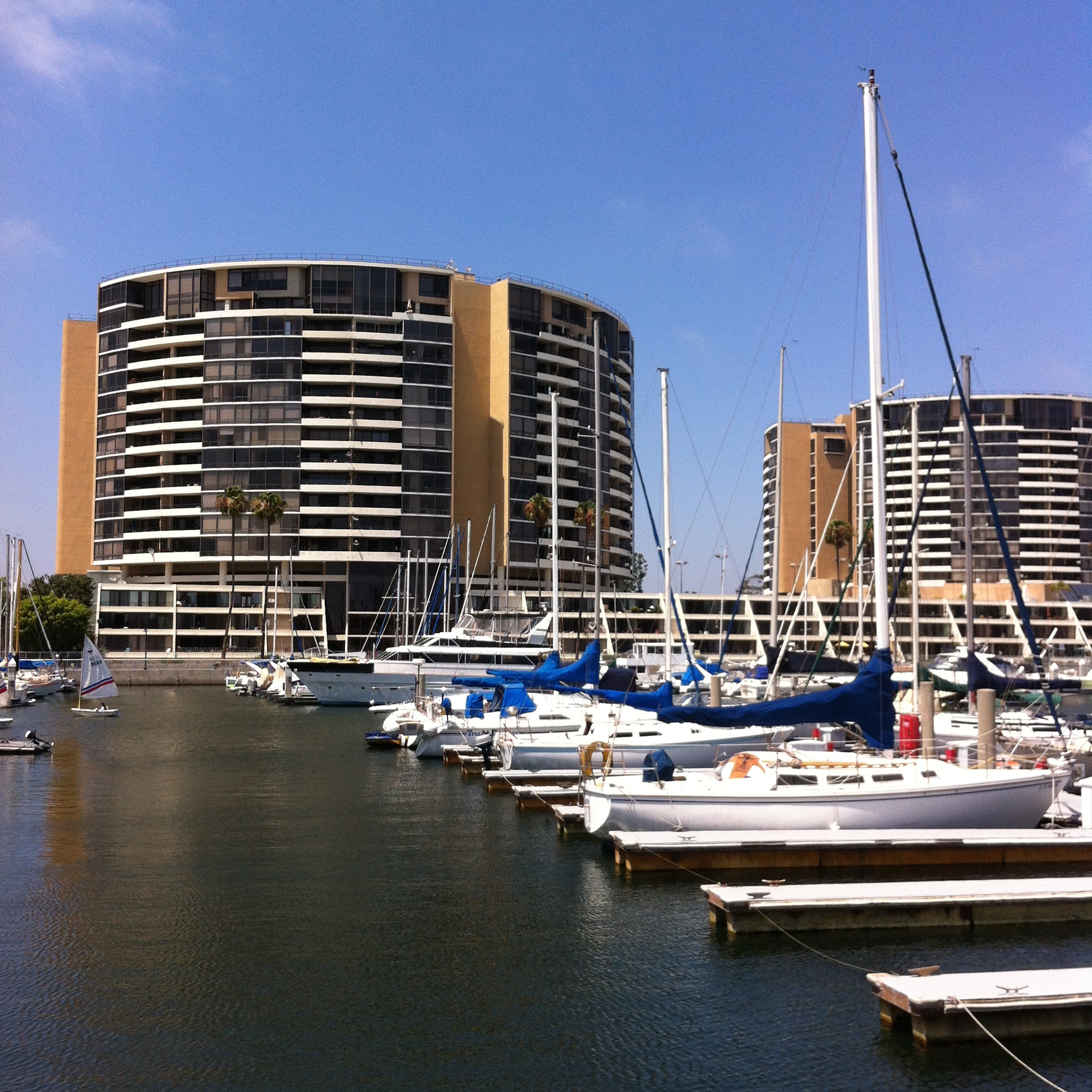 The Marina City Club encompasses three early 1970s high rises which are entered securely by several guarded driveways on Admiralty Way. This complex has swimming pools, tennis courts, a convenience store, but is threatened by similar structural defects that brought down the Surfside, Florida condominium in 2021, killing 98 persons.