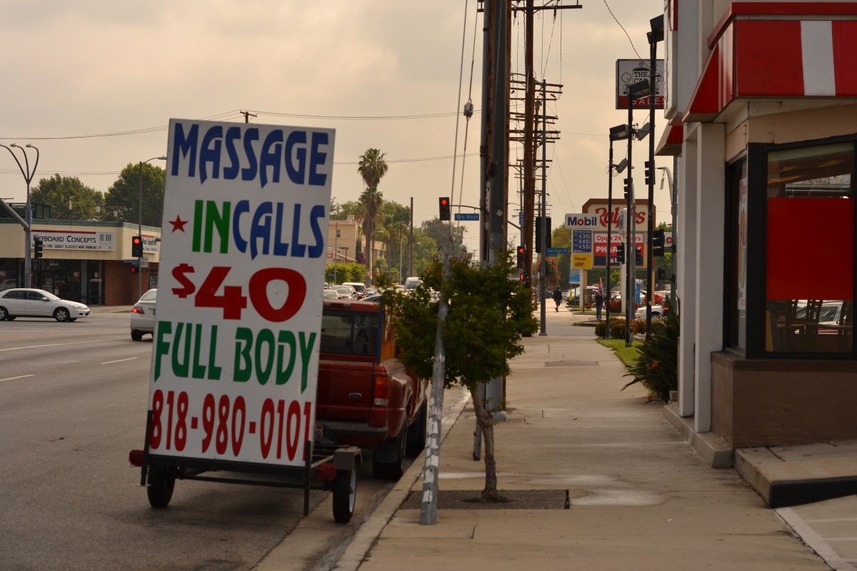 On Burbank Boulevard, near Van Nuys Boulevard, this sign jumps across each side of the street every few days. The parking signs clearly state “One Hour” but this truck and its attached sign spend days and nights here camping out. This sign blocks traffic, creates a roadside hazard, slows down drivers and demoralizes our aesthetics.