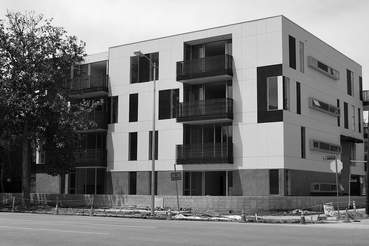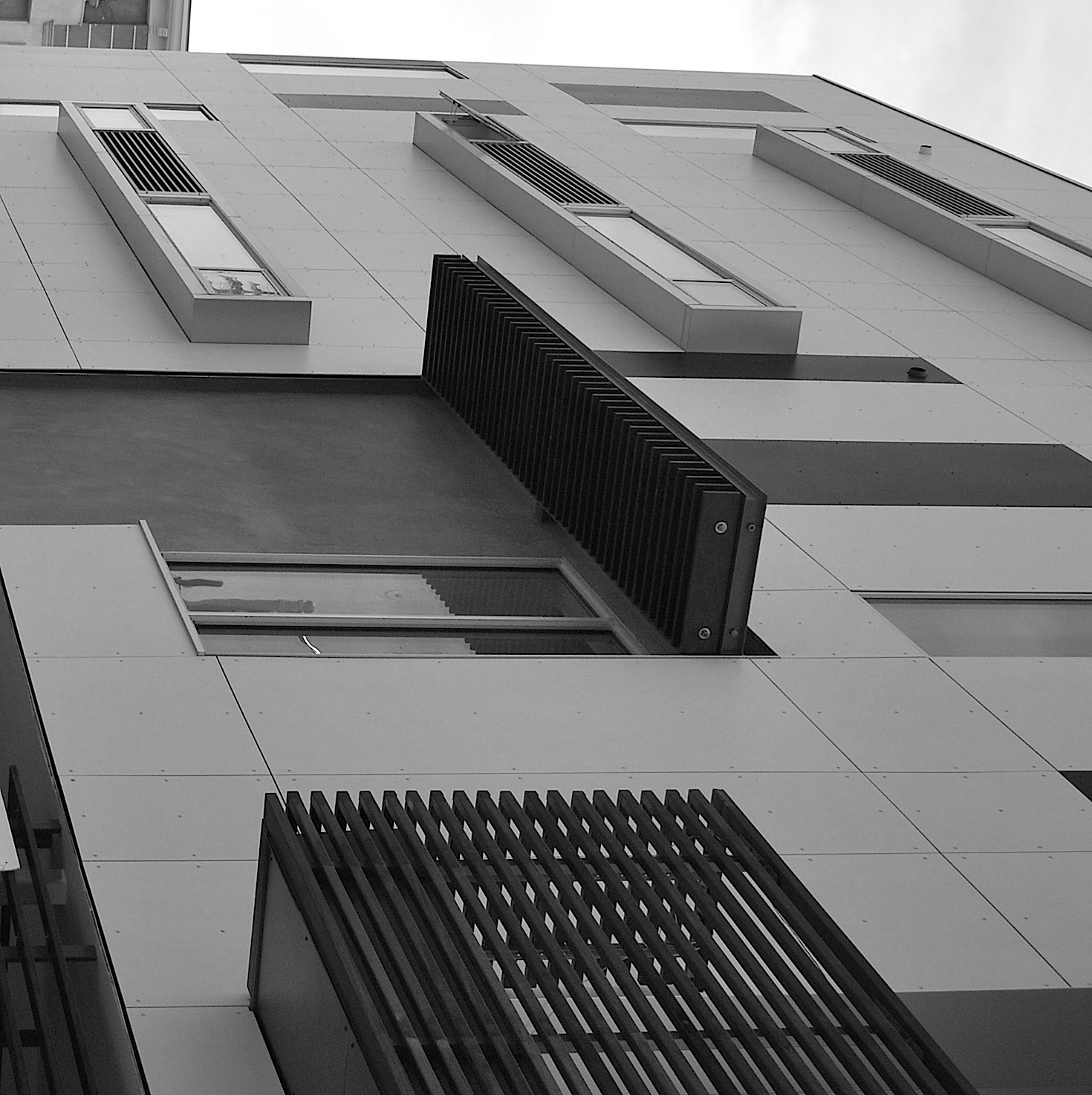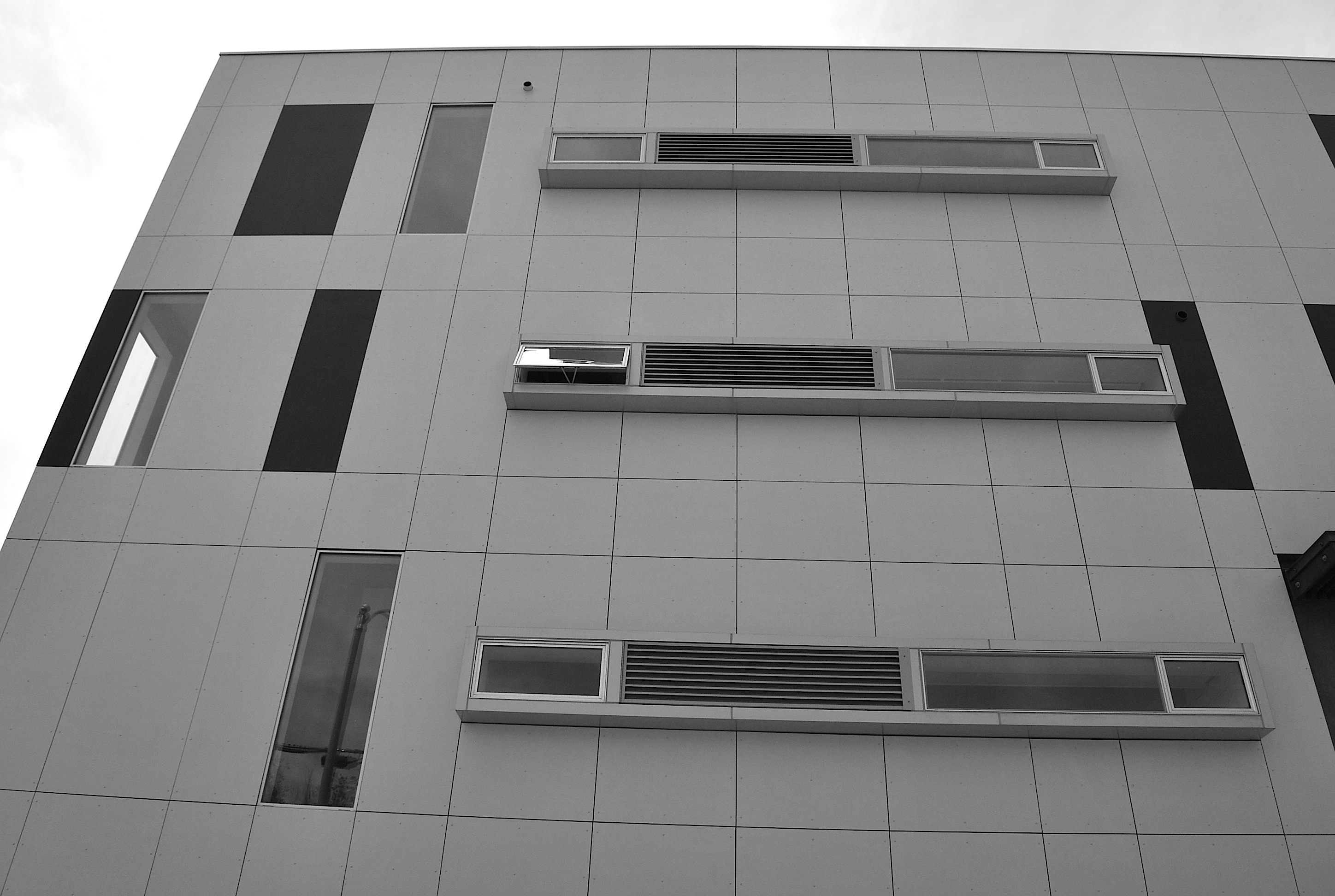 In the waning light of day, the strange and introverted building, sliced and angled, with a pie shaped courtyard and concrete amoeba benches, presented itself as liberal, caring, and vulnerable.