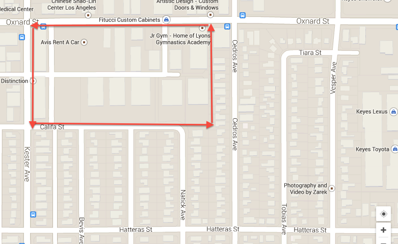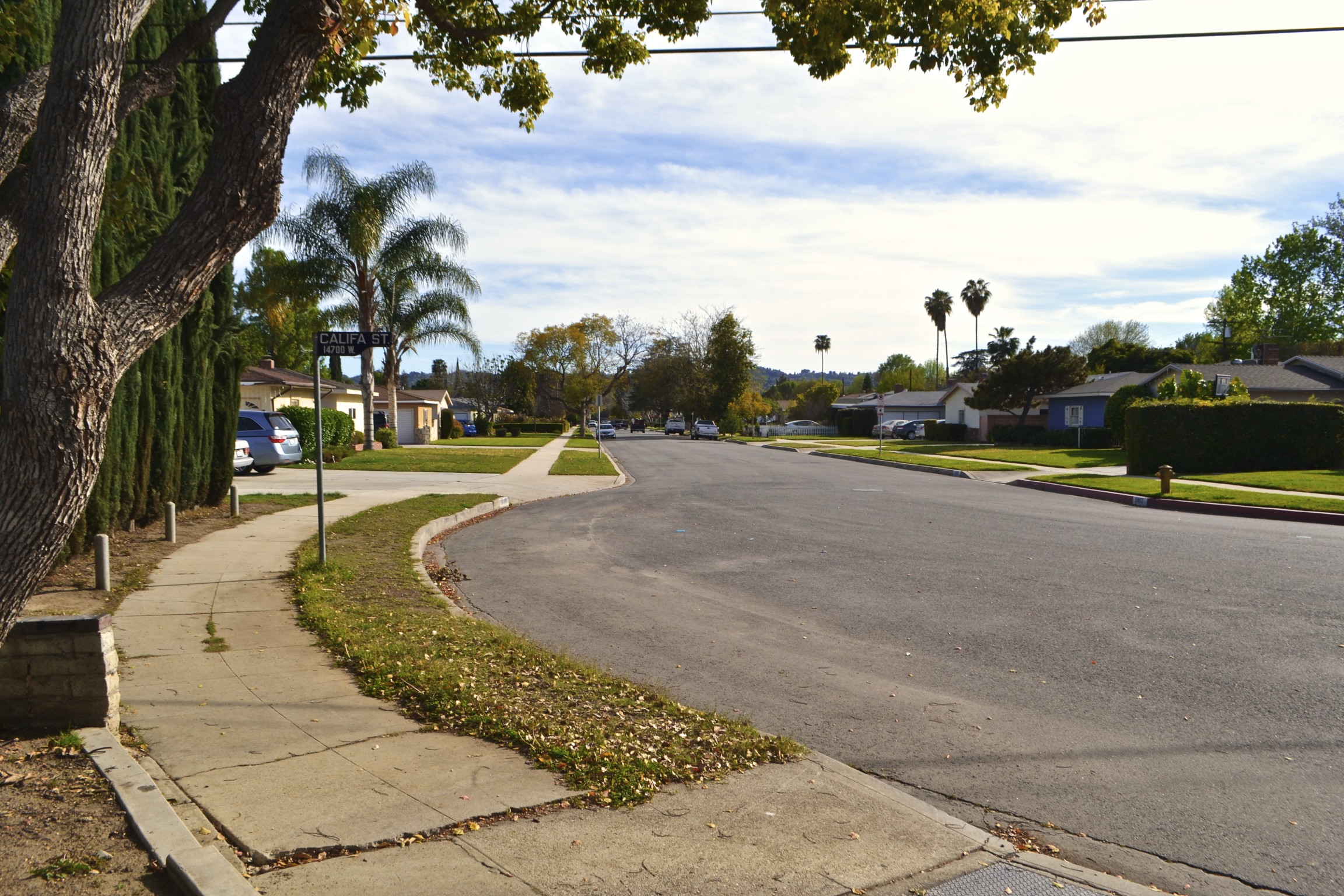 A block south of Oxnard, between Kester and Natick Avenues, four residential streets dead end at Califa.