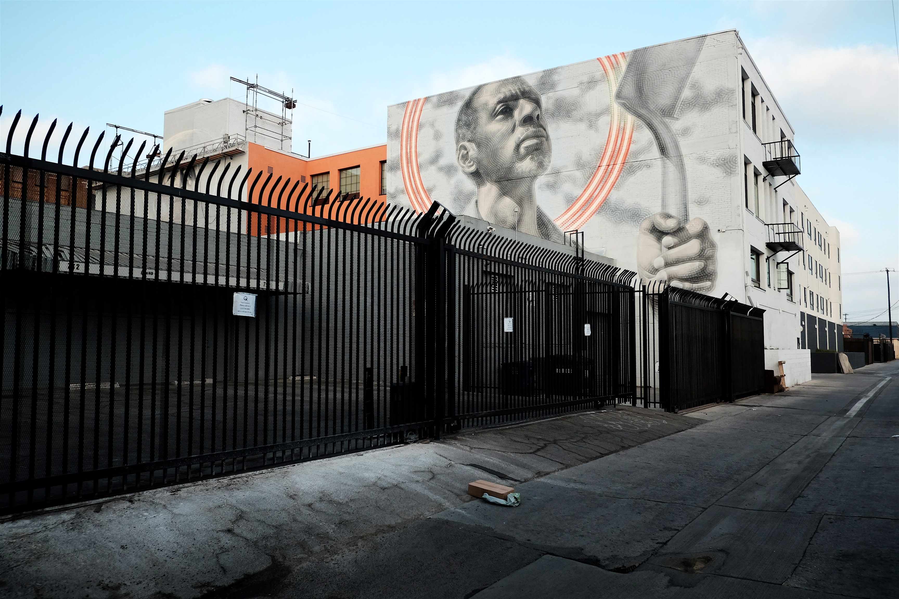 On Washington Boulevard light rail zooms past architectural relics from the past century: the Scully Building at 725 was built in 1930 and is a spectacular “Gotham City” type of Art Deco with steel windows and vertically decorated brickwork and carved stone; 722 was built in 2017 and is a new 55-unit apartment with government backed funding providing decent housing in a city starved for it. A mural on the side of the building is spectacularly subtle, artist unknown.