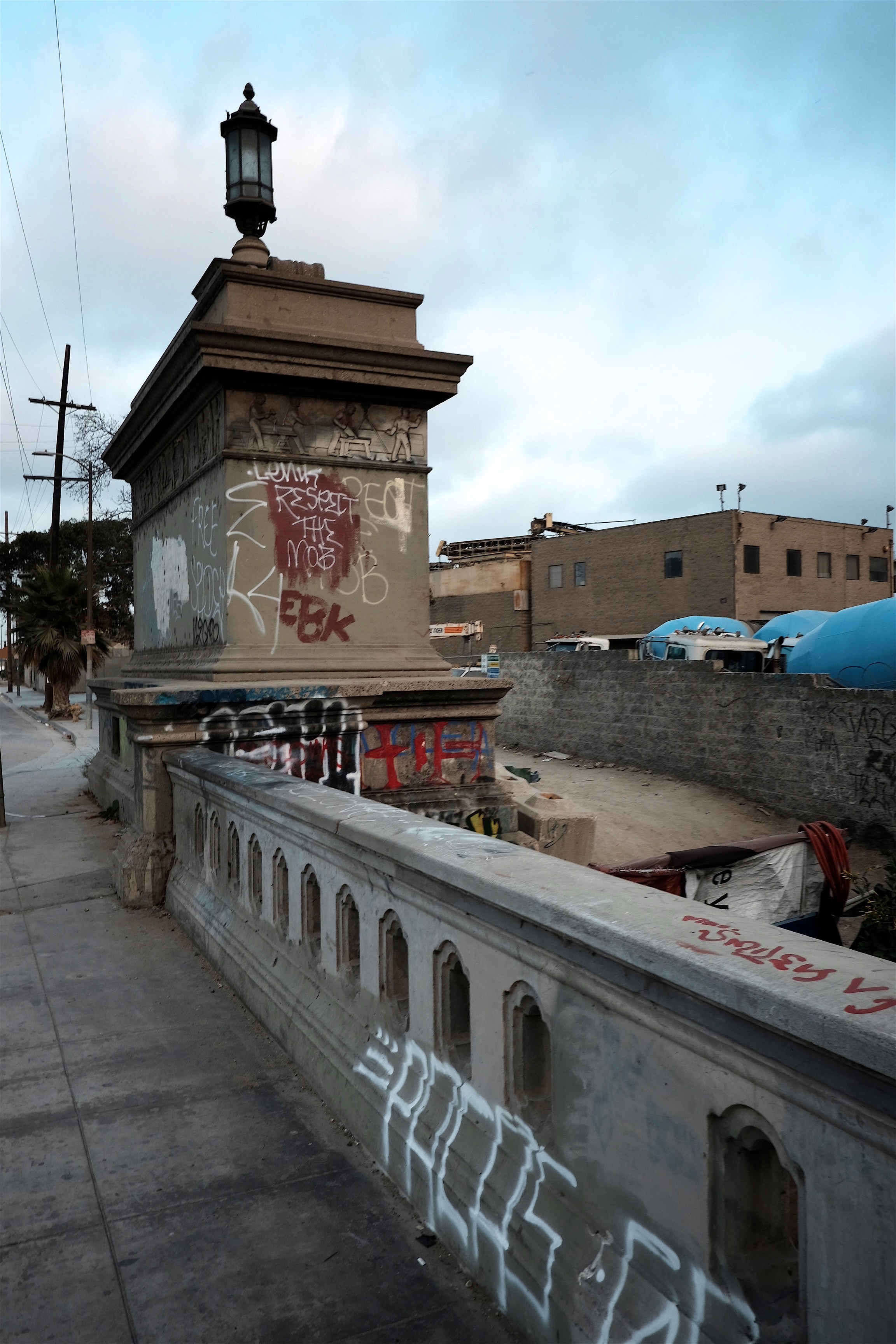 Our tour ended, and culminated, in the glorious Washington Bl. Bridge (1930) that crosses the LA River, its majestic classicism fouled up by graffiti. Yet its polychromatic terra cotta frieze panels, depicting the art of bridge building, are still present, if grimy, on the four pylons on each side of the structure.