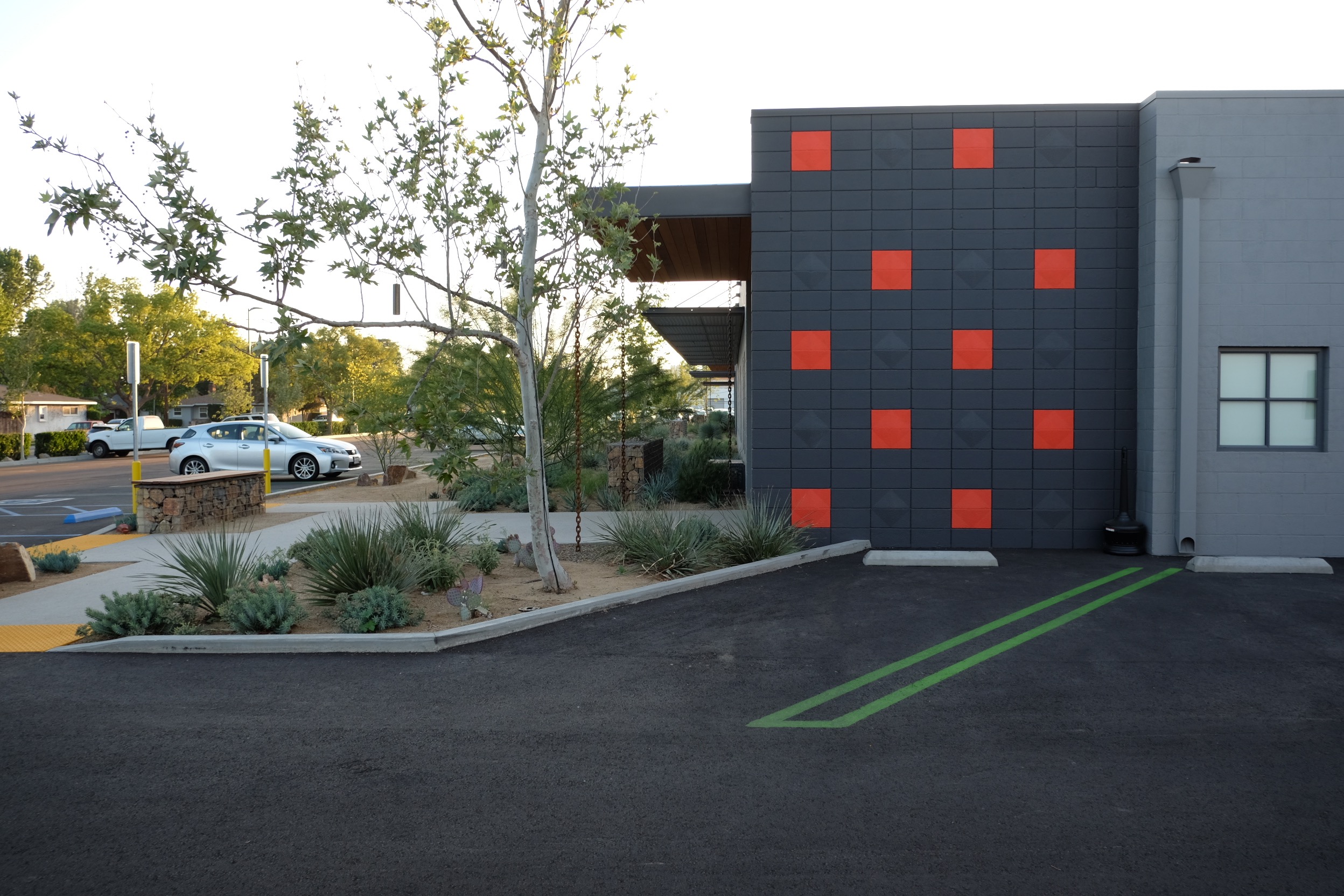 At 14801 Califa, (near Kester and Oxnard) a property investor has taken a large industrial park and transformed it into a modern post-industrial building. It has been landscaped with trees and plants, painted gray, adorned with metal doors and windows in a style best described as Culver City North. Envisioned as a rental property for media companies, it is within walking distance of the Orange Line.