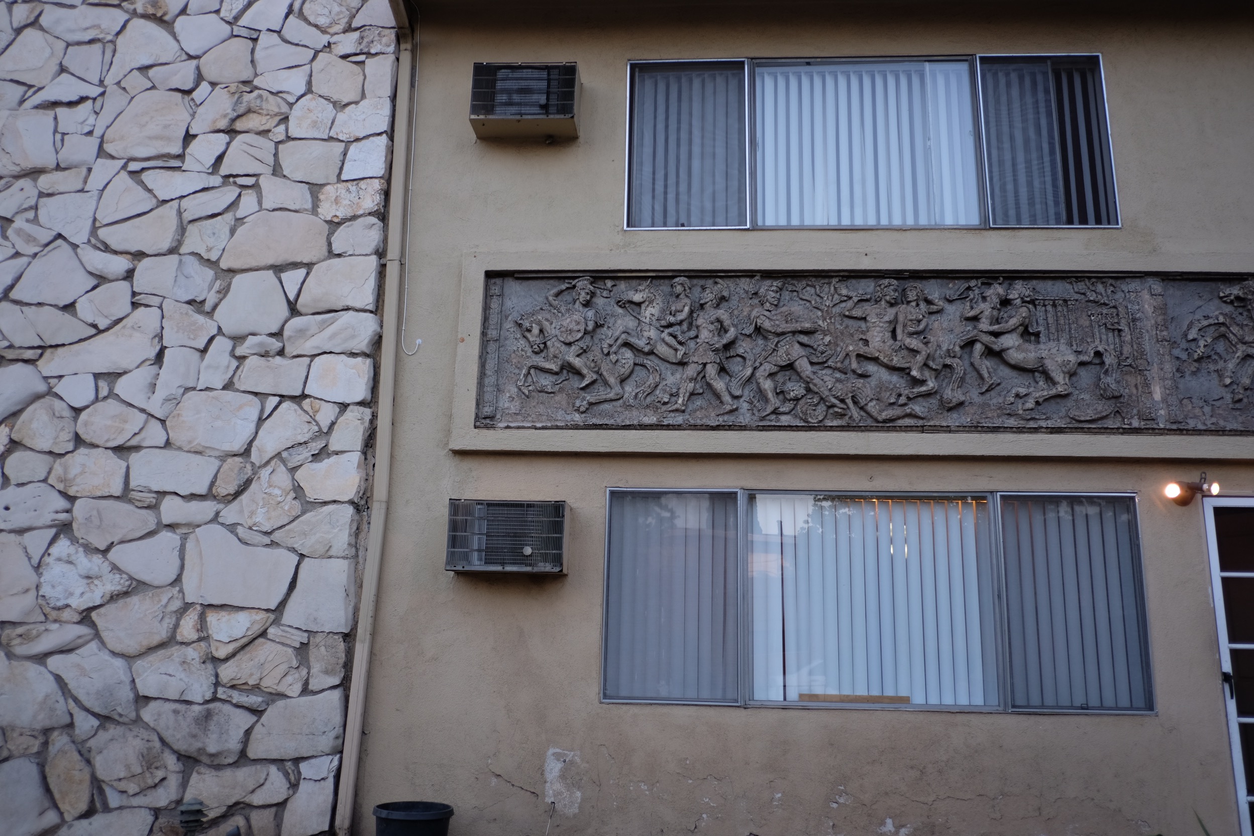 6315 Kester is a two-story courtyard apartment building built in 1961. A bizarre (or unique) frieze of Roman soldiers on horses decorates the exterior. Starved for ornamentation, post-war architects in the late 1950s and early 60s borrowed from epic movies like “Ben Hur” (1959) or “Cleopatra” (1963) to cinematically embellish properties.