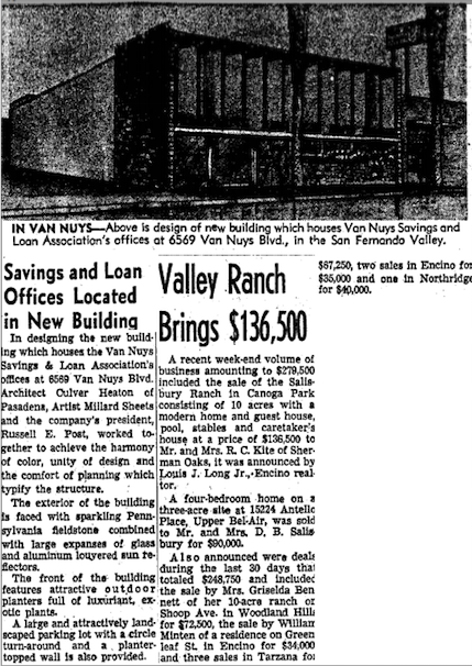 In 1954, architect Culver Heaton’s design for the Van Nuys Savings and Loan, with interior murals by artist Millard Sheets, rose at 6569 N. Van Nuys Bl.
