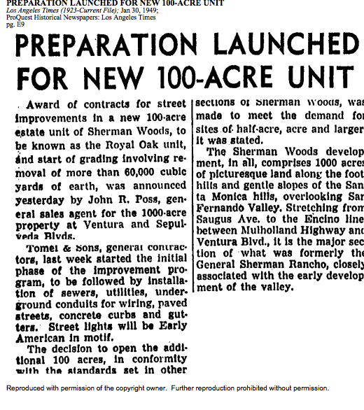 The 1000-acre estate of General Sherman was subdivided into various tracts, and given a pretentious name: Royal. There would be Royal Oaks and Royal Woods and Sherman Woods. These luxury homes in California Ranch, Early American, English Tudor and other styles would nestle in the low foothills of Sherman Oaks and usher in a new chapter of suburban life for the socially upward class of settlers.