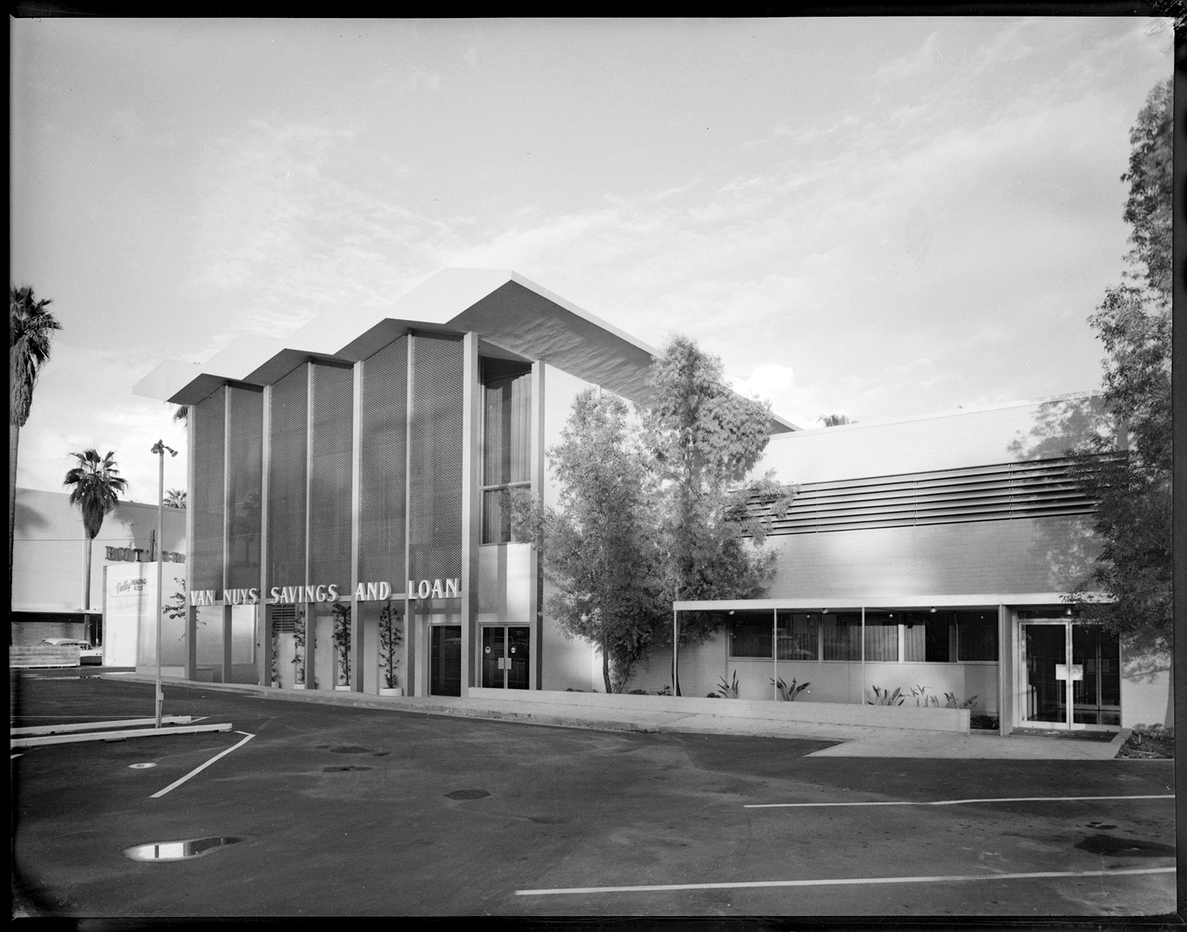 Photographer Maynard Parker shot these images of the bank exterior and interiors. They bespeak a dignified and progressive institution whose architecture was as up-to-date as its vision of a prosperous, safe Van Nuys. A sign on the outside of the building reads “The Home of Security” leaving no doubt to depositors about the solidity of the S&L.