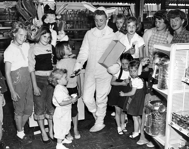April 9, 1955: “‘This bunny is a honey’ say the ‘small-fry’ making their pre-holiday visit with the Builders Emporium Easter Bunny at Sepulveda and Oxnard in Van Nuys. The ‘B. E. Bunny’ passed out thousands of free chocolate rabbits to the youngsters at the giant hardware store.”