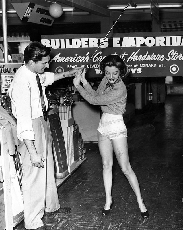 Photograph caption dated April 29, 1955 reads “Motion picture and TV Eyeful Norma Brooks gets close supervision on proper stance to be used when teeing off from attentive golf pro Jim Curtis, preparatory to free four-day clinic of Builders Emporium.” The store is located at 5960 Sepulveda Boulevard in Van Nuys.