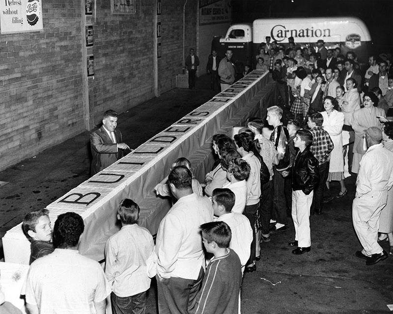 October 13, 1955 : “First slice of spectacular 40-foot birthday cake is being served by Victor M. Carter, store president, at ninth anniversary celebration of Builders Emporium, Sepulveda Boulevard and Oxnard street, Van Nuys. Cake was served with ice cream to thousands of visitors who joined in festivities.”
