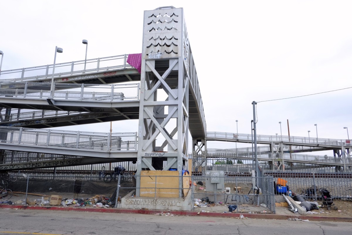 The bridge over the railroad tracks has been, naturally, taken over by the homeless who live under, in and on top of the structure. They cross on foot over the tracks where Metrolink speeds by a few times an hour.
