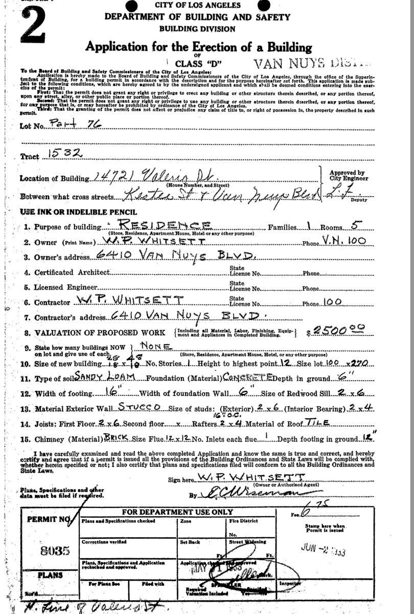Built in 1933, by one of the founders of Van Nuys, Mr. WP Whitsett, for $2,500 (two-thousand five hundred dollars) it is now on the market for $1.1 million dollars.
