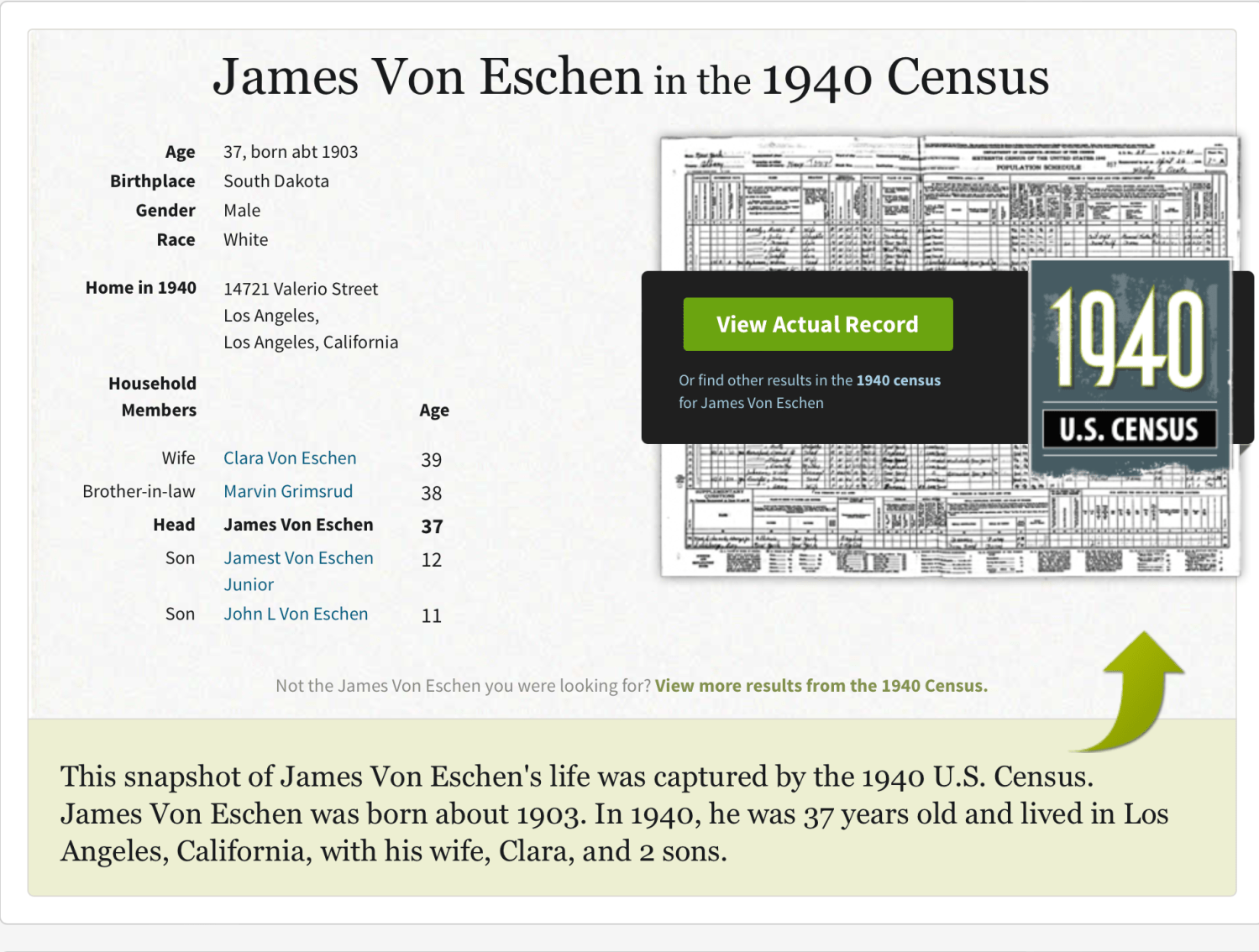 The 1940 US Census says Mr. Von Eschen was born in 1903, and the couple had two sons, James, 12 and John, 11. Marvin Grimsrud, brother-in-law, 38 years old, also lived in the house.