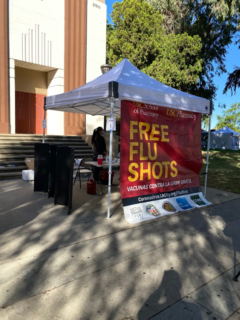 The assistants were nice, helpful. Their boss was too, after she had been interviewed by CBS news. Then you were done with the fill in the information on your smartphone and you sat down in a tent, and took off your sweater, your sweatshirt, all the layers you wore on this blustery day, and then you got your flu shot.
