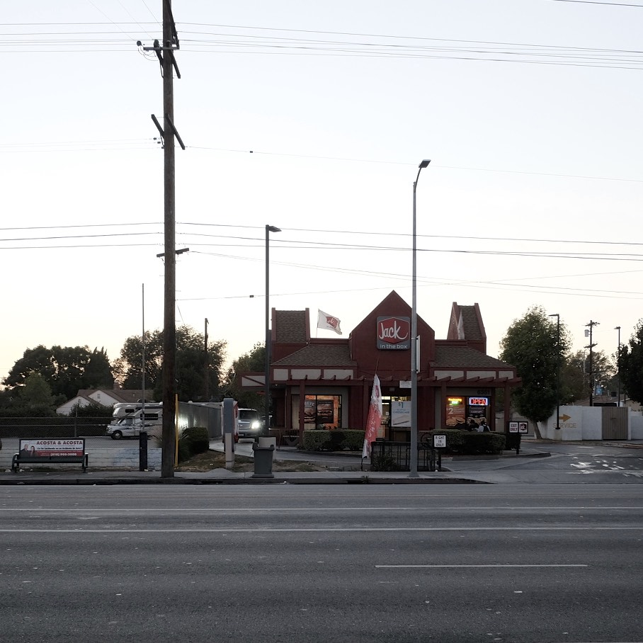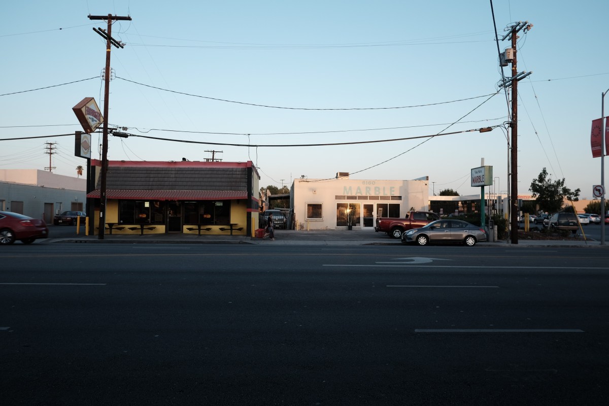 At dusk, with the early October sun hitting the one-story buildings, there is a homely, lowbrow, neat banality to the structures along this stretch.