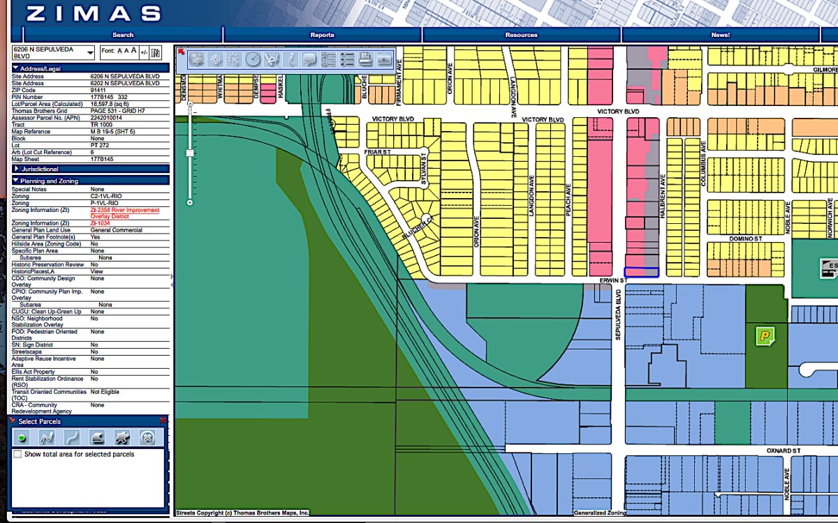 Available online for public research, is the Los Angeles’ ZIMAS, a website run by the Department of City Planning. Here one can select a parcel, for example, 6206 Sepulveda Blvd., where The Barn furniture store is located, and see that it occupies two parcels totaling 44,250 SF. It is not, according to ZIMAS, in a transit-oriented area, nor is it designated as a pedestrian oriented one, nor is it part of a community redevelopment one.