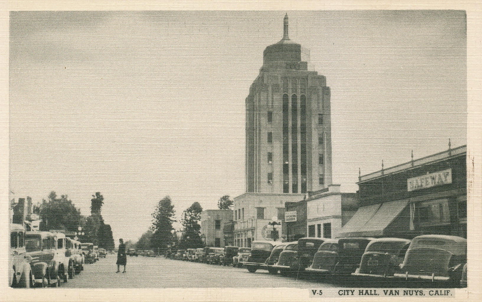 A 1930s view of Van Nuys, along Sylvan Street, towards the Valley Municipal Building, shows diagonally parked cars and a “Safeway” store.