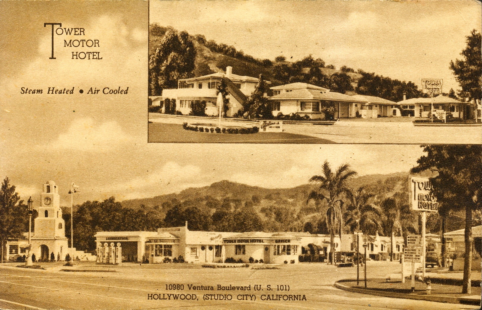 Thirty or so years later, the Tower Motor Hotel at 10980 Ventura Blvd in Studio City was smartly streamlined with gas pumps in front, steam heat and air-cooled rooms.