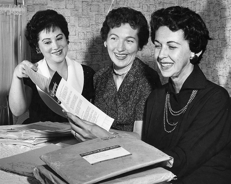 October 21, 1959 reads, “Officers of Sierra Cahuenga District Junior Clubwomen read reports by postal authorities on mail-order pornography problem in United States and pledge their organization to help fight ruthless racket. From left are Mmes. I. M. Kenoffel, district president; Edwin Flues, president of Van Nuys Alpha Juniors, and Paul H. Parker, district youth committee chairman.”