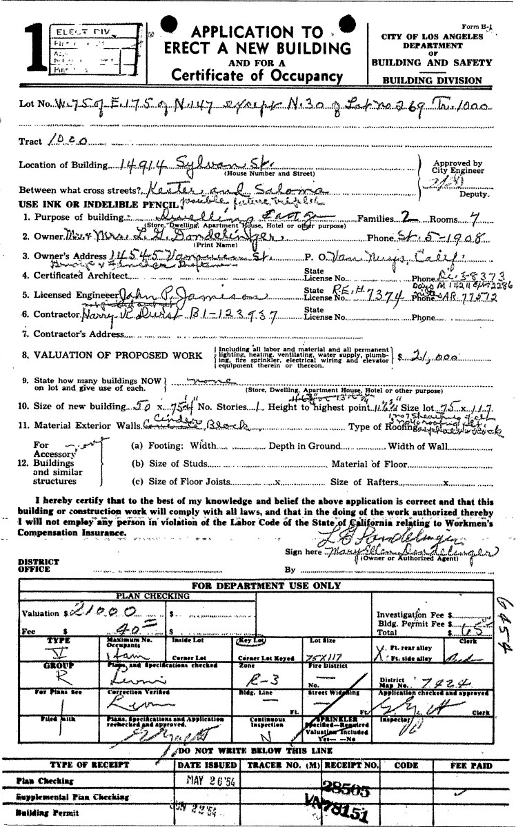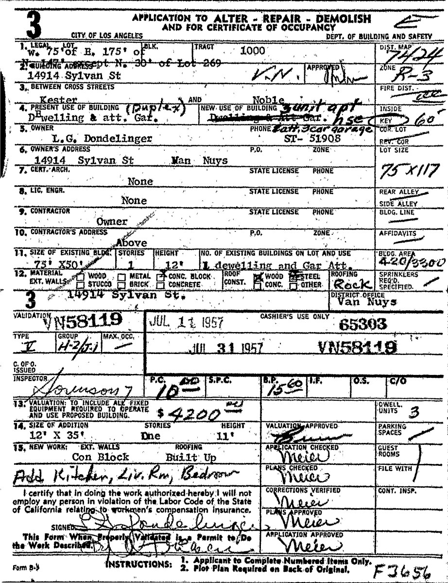 He seems to have done fine with his new house, and in 1957, 55-year-old Leroy built a $4,200 addition to 14914 Sylvan which included a back lot kitchen, living room and bedroom.