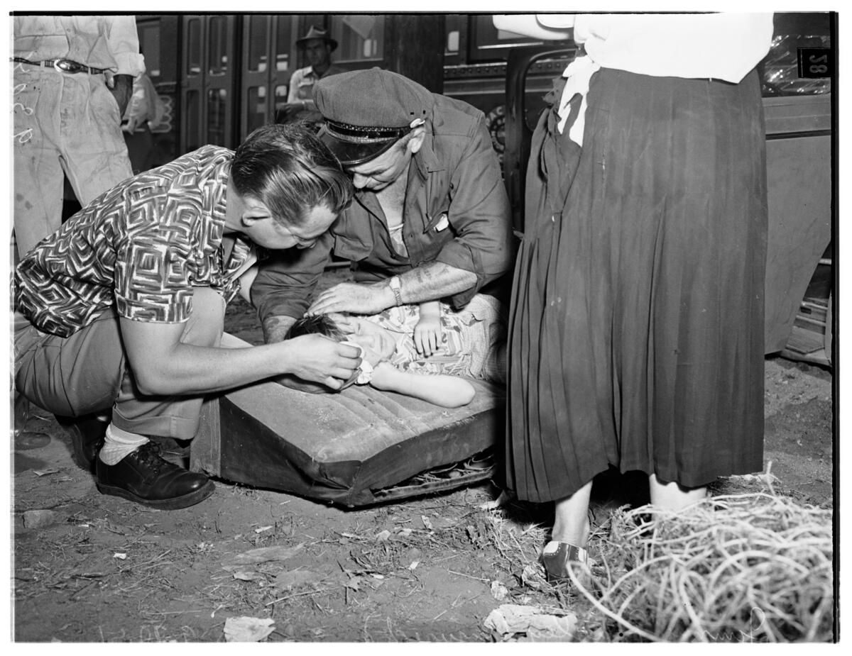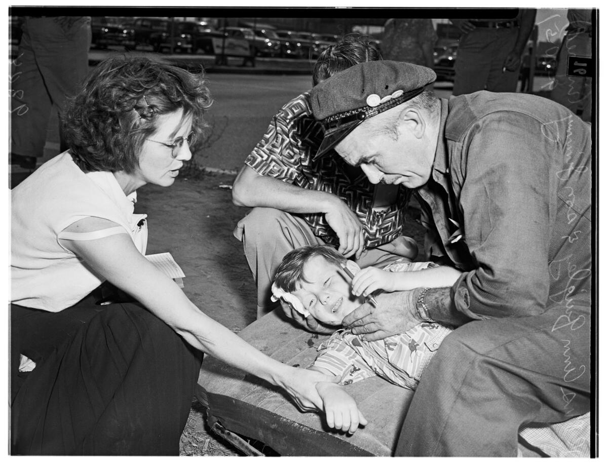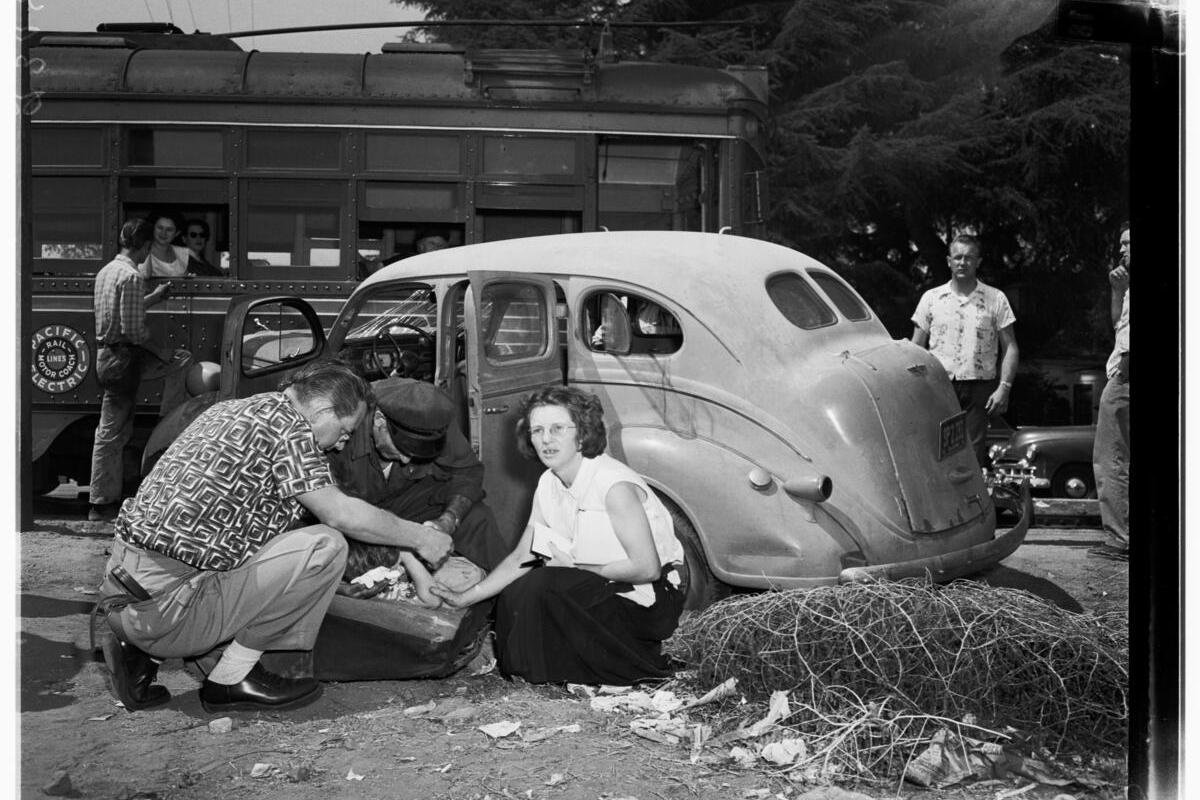 “Pacific Electric versus auto (Van Nuys Boulevard and Hatteras Street, Van Nuys), 20 September 1951. Jimmy Quigley; Ann Quigley (mother); E.T. Ophus (motorman).; Caption slip reads: “Photographer: Glickman. Date: 1951-09-20. Reporter: Glickman. Assignment: Pacific Electric versus auto. Van Nuys Boulevard and Hatteras Street, Van Nuys. Passersby comfort Jimmy Quigley as his mother, Ann stands along side of him (in torn skirt). Motorman in picture is E.T. Ophus, who piloted Pacific Electric that hit Quigley’s car”.”