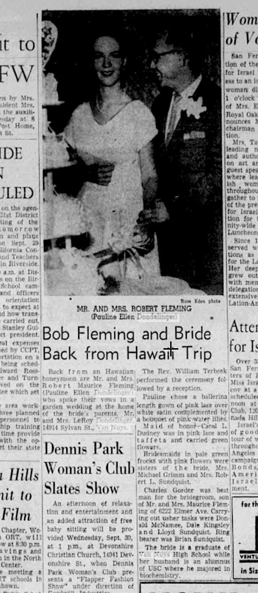 I searched newspaper archives for Dondelinger references, and by wacko coincidence, the fancy home of my neighbors at 14937 Hamlin was the subject of a 1948 Van Nuys newspaper story about “Impressive Fly-Up Ceremonies” conducted by Brownie Girl Scout Troops at the home of Lucile F. Days. Mrs. Mary Ellen Dondelinger was the leader of Troop 716.
