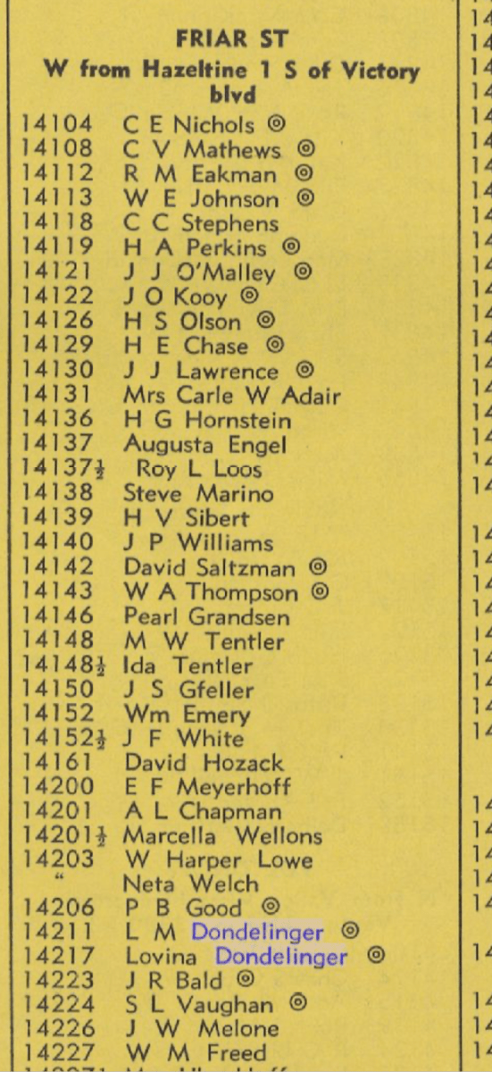 The 1937 San Fernando Valley Directory listed DWP lineman Leroy Dondelinger (b.4/15/1902, Colfax, NE/d.10/27/85 Santa Barbara, CA) and his wife of 12 years, Mary Ellen (nee Fridell; 1902-1980) living at 14545 Vanowen St.