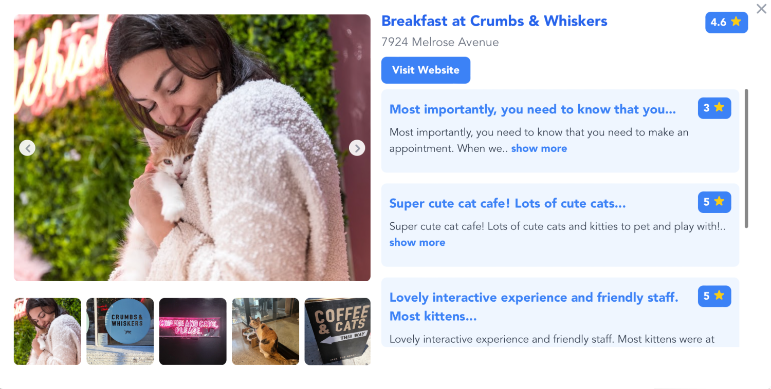 We are eating breakfast (from 8am to 9am) at Crumbs and Whiskers 7924 Melrose Avenue. I leave my house at 7am because I know traffic is heavy over Laurel Canyon.