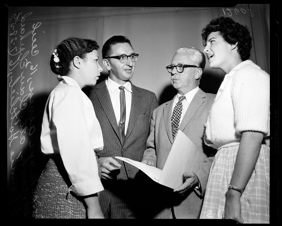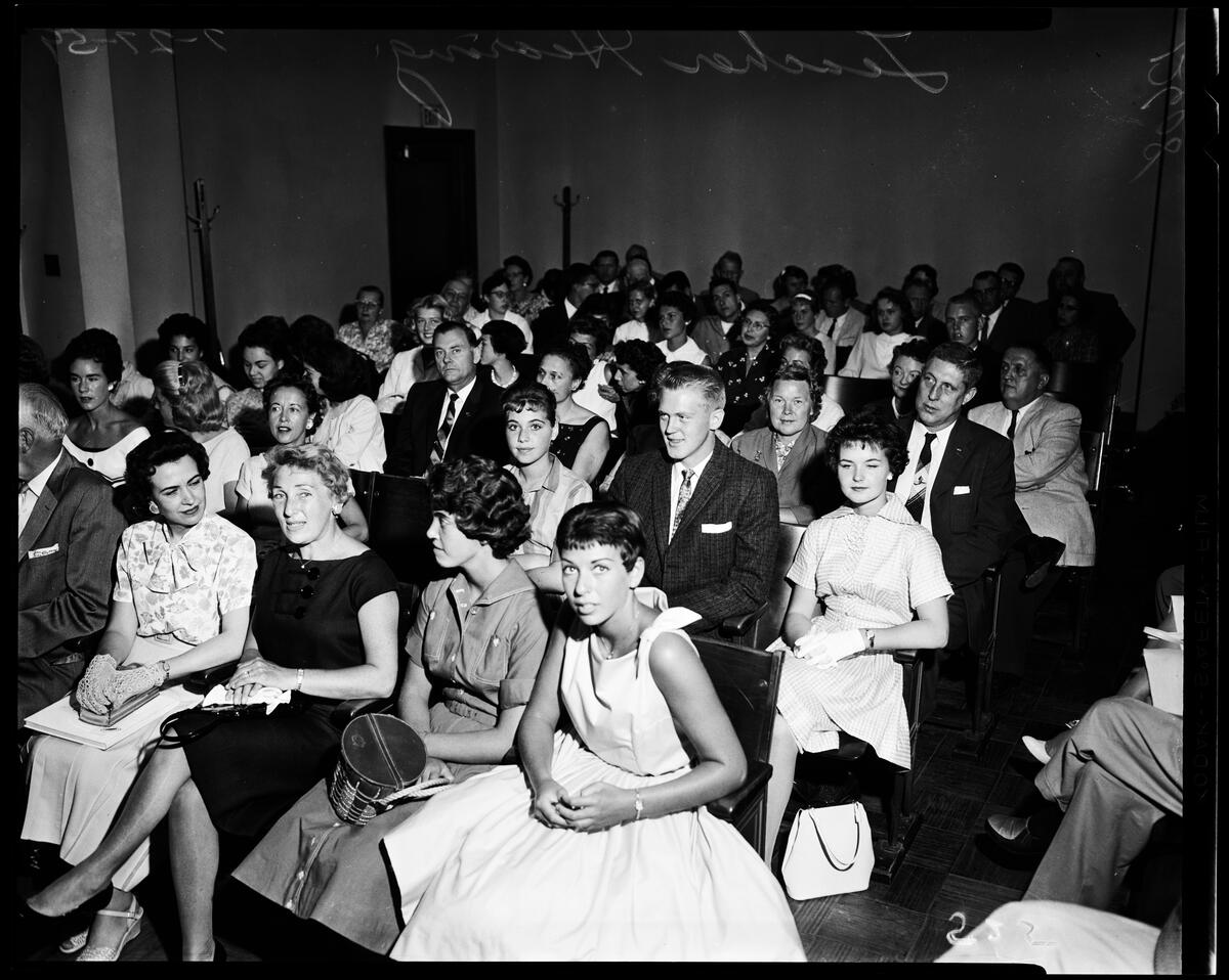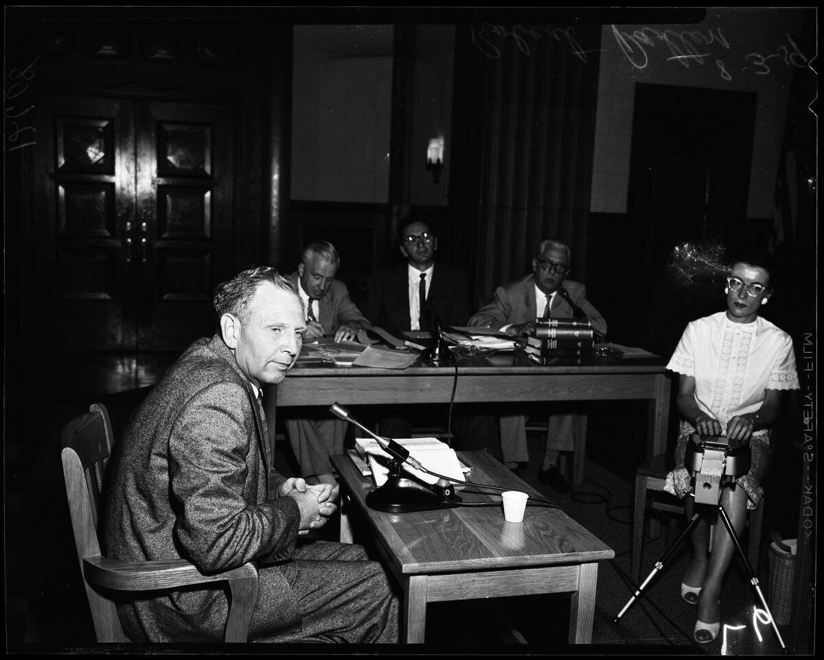 2 images. Teacher hearing on sex instruction at Van Nuys school, 28 July 1959. Charles H. Bobby; John Fox; Lowell McGinnis; Diane Asness — 16 years; Cecil M. Cook (teacher); Clair Eberhard; Bonnie Gottleib — 16 years.; Caption slip reads: “Photographer: Snow. Date: 1959-07-28. Reporter: Slates. ASsignment: Teacher hearing. 3-4: L/R Diane Asness, 16; Cecil M. Cook; Clair Eberhard; Bonnie Gottlieb, 16. 51-52: L/R Charles H. Bobby; John G. Fox; Lowell McGinnis”.
