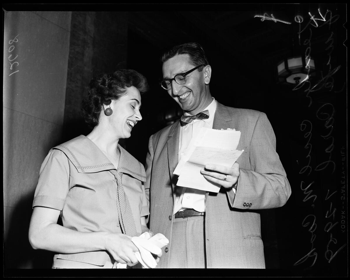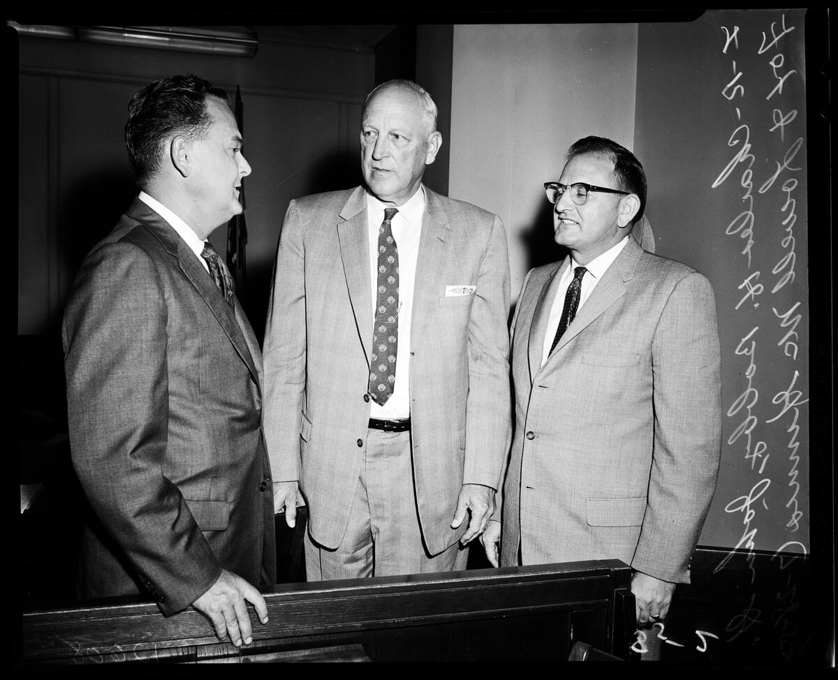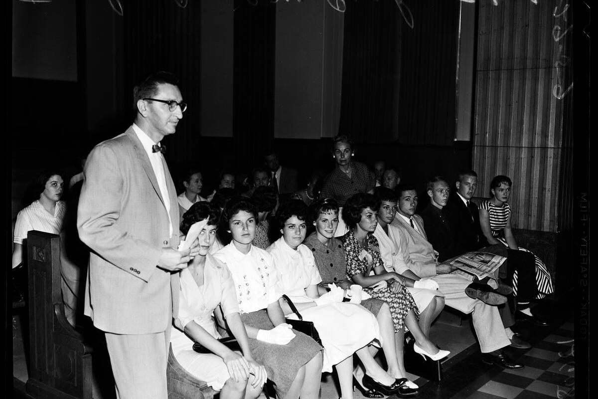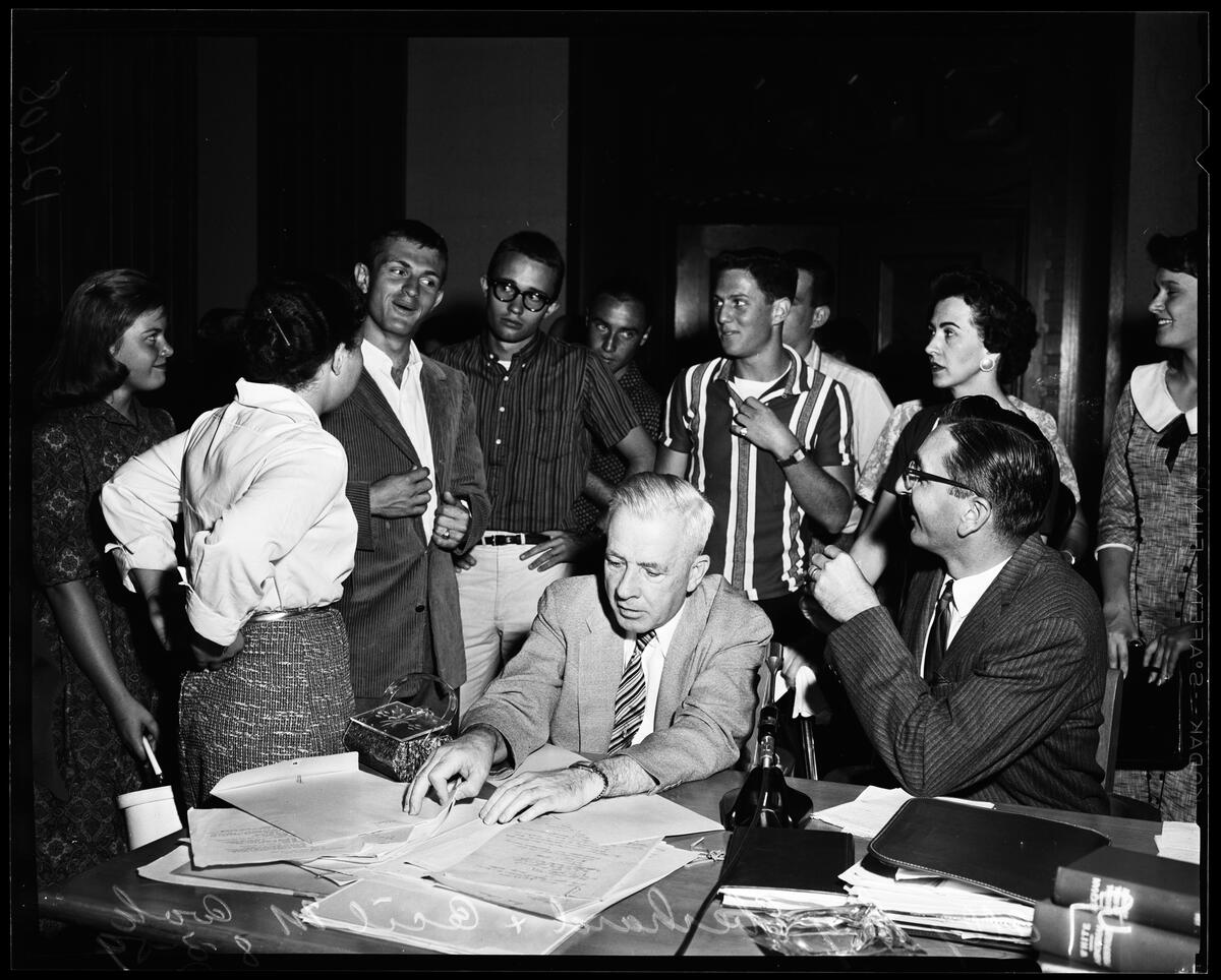 2 images. Teacher hearing on sex instruction at Van Nuys school, 28 July 1959. Charles H. Bobby; John Fox; Lowell McGinnis; Diane Asness — 16 years; Cecil M. Cook (teacher); Clair Eberhard; Bonnie Gottleib — 16 years.; Caption slip reads: “Photographer: Snow. Date: 1959-07-28. Reporter: Slates. ASsignment: Teacher hearing. 3-4: L/R Diane Asness, 16; Cecil M. Cook; Clair Eberhard; Bonnie Gottlieb, 16. 51-52: L/R Charles H. Bobby; John G. Fox; Lowell McGinnis”.