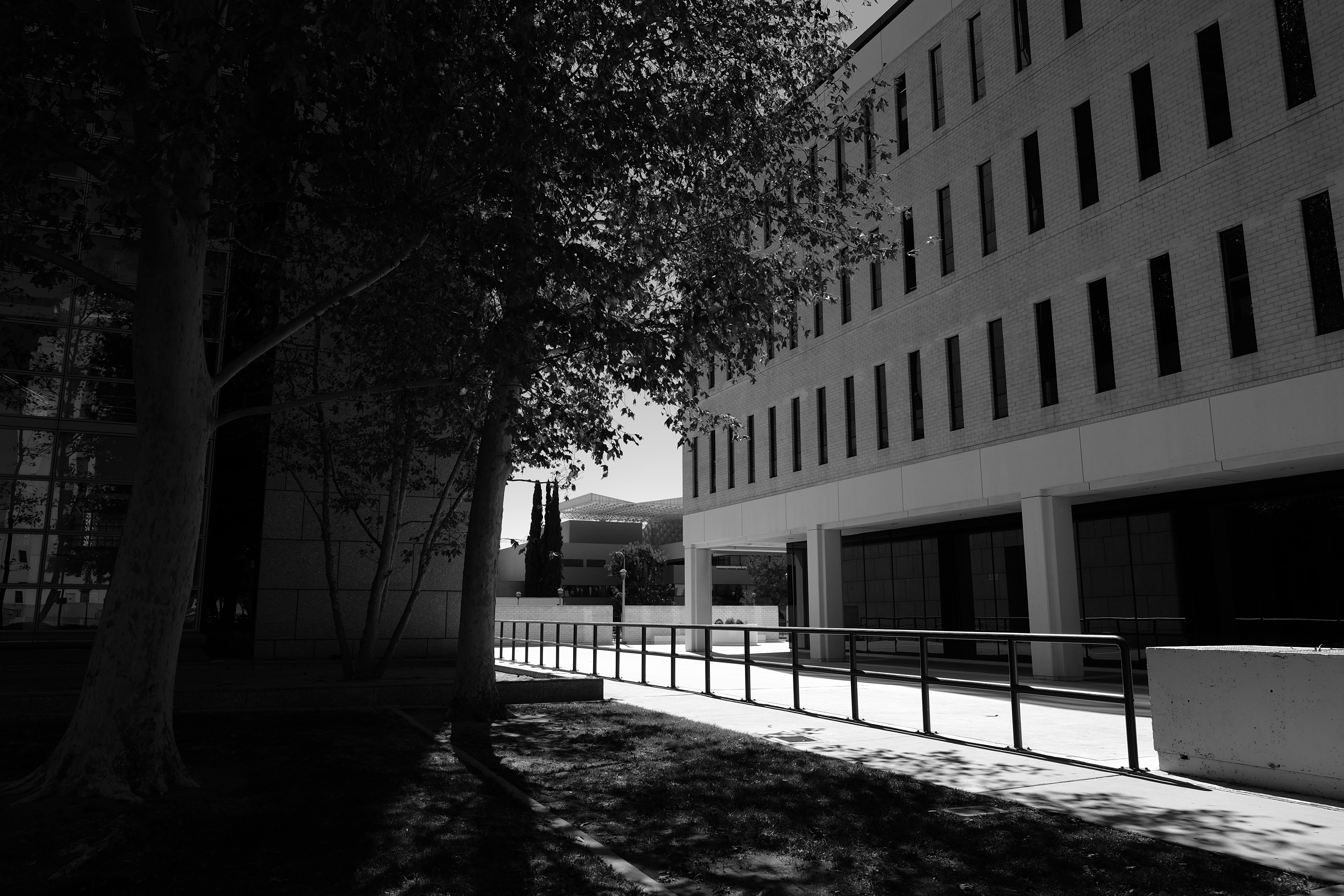 The photographs are in black and white, the buildings are stark, the plazas empty, the sun and shadows stark, clear and sharp.