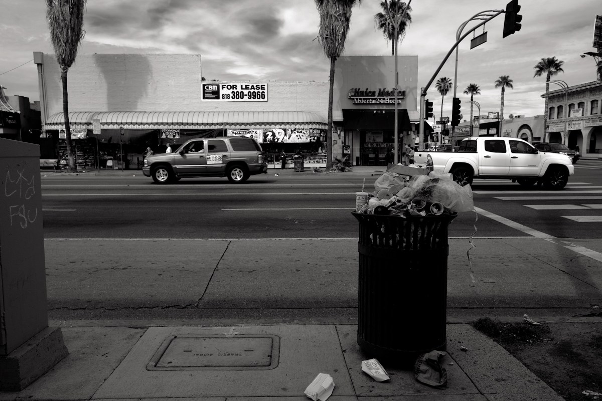On the corner of Van Nuys Boulevard and Victory, the symbol of Van Nuys: an overflowing trashcan.