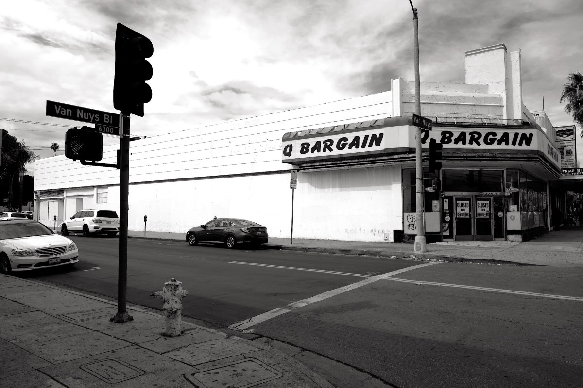 The Q Bargain Store at 6351 Van Nuys Bl. was built as Sontag Drugstore in the 1940s. It still has the streamlined look of its youth. Like all of Van Nuys Boulevard north of Oxnard, it got old, it got poor, and we all got fucked.