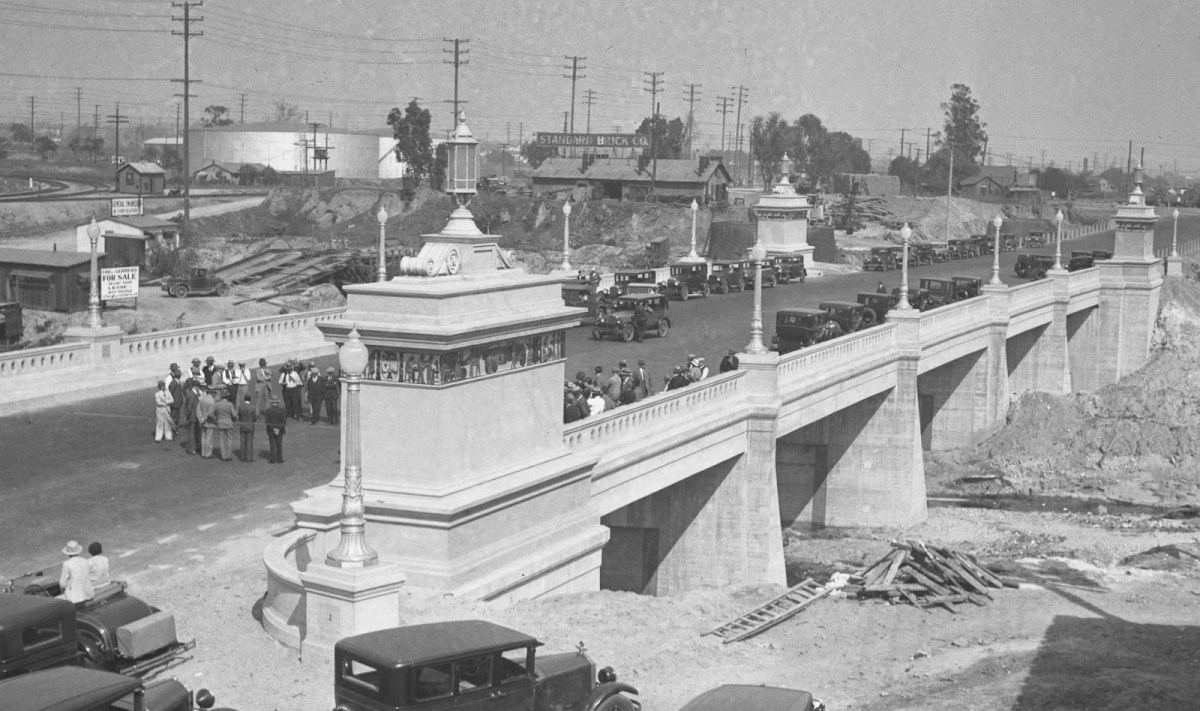 Our tour ended, and culminated, in the glorious Washington Bl. Bridge (1930) that crosses the LA River, its majestic classicism fouled up by graffiti. Yet its polychromatic terra cotta frieze panels, depicting the art of bridge building, are still present, if grimy, on the four pylons on each side of the structure.