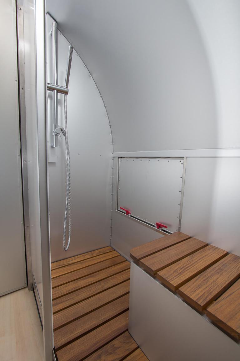 26 feet long, six and a half wide, 3,200 pounds, the aluminum skinned, aircraft riveted trailer sleeps four. The all-wood interior features anodized galley, five silent gravity ceiling vents, LED Lighting, luxury commercial grade flooring, hotel bathroom with privacy doors, Italian Marine shower head, vanity, and toilet with a hygienic, “easy emptying cassette system.” There is also a stainless steel bathroom sink, teak shower seating and flooring, and yours and mine large wardrobes with hanging bars.