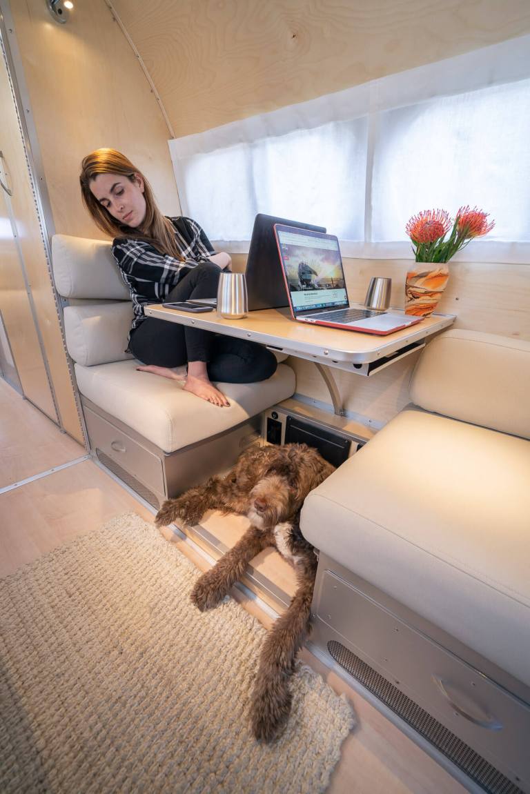 You can park, off-grid, in any desert and still enjoy a powerful, lithium iron, phosphate power system that runs for seven days. Even the A/C blows for up to four hours a day without current. Control it all on your smart phone. If it gets cold at night, don’t worry, the floors are heated and there is continuous hot water.